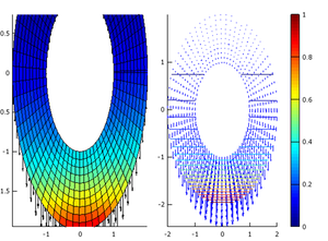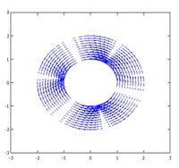 Nuestra placa sufre deformaciones debido a una percusión dada en un t0. Esta percusión viene dada en forma de campo vectorial, el cual es el siguiente: [math] \vec u(\rho,\theta)=\frac{\sin(\pi \theta)}{20\rho^2}\vec g_{\theta}. [/math]