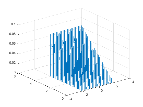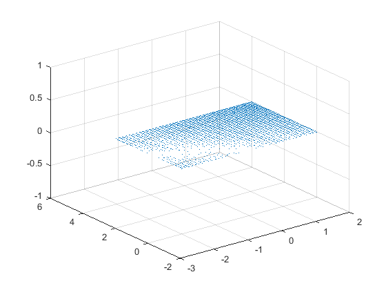 En primer lugar dibujaremos un mallado que contenga todos los puntos del interior del sólido. Tomamos los ejes en el rectángulo definido por [math] -3≤x≤3;0≤y≤5 [/math], y utilizamos como paso de muestreo [math] h=1/10 [/math] para las variables x e y. Para ello utilizamos el siguiente código: