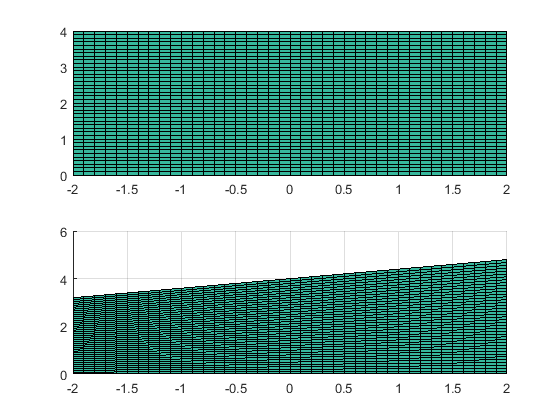 Seguidamente tenemos el sólido antes de la aplicación del desplazamiento, así como el resultado de aplicarlo después. Aplicamos el comando subplot, como se nos indica, para que las dos representaciones queden sobre la misma gráfica. El código es: