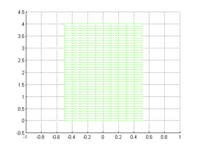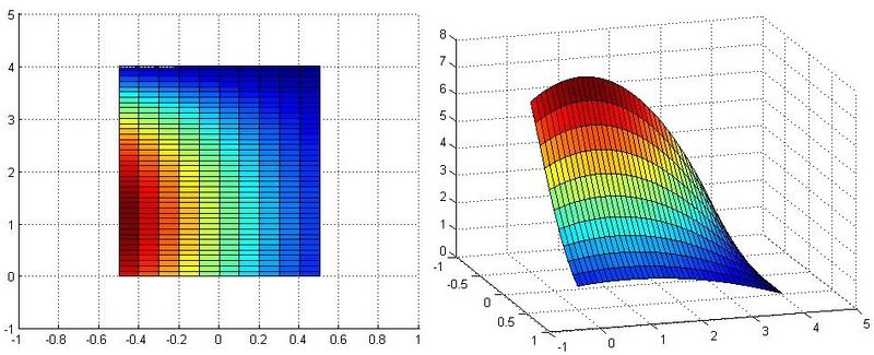 Visualización de campos escalares y vectoriales en elasticidad. Consideramos una placa rectangular plana (de dimensión 2) que ocupa la región [-1/2, 1/2]x[0,4]. En ella vamos a suponer que tenemos definidas dos cantidades físicas: la temperatura T(x,y), que depende de las dos variables espaciales (x,y), y los desplazamientos [math]\vec u(x,y,t)[/math] producidos por la acción de una fuerza determinada.