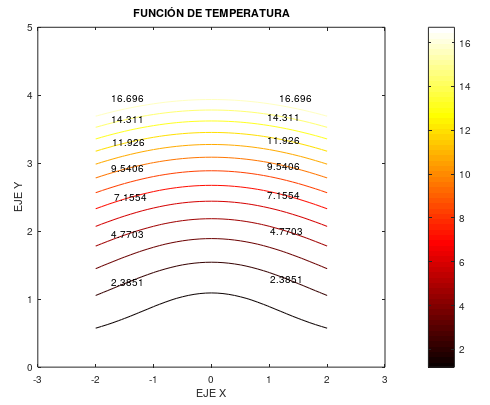 Para la mejor visualización del campo de Temperatura en la placa, dibujamos las líneas de nivel del mismo, obteniendo el máximo valor en el punto (0,4) de la placa con un valor de 17.889.