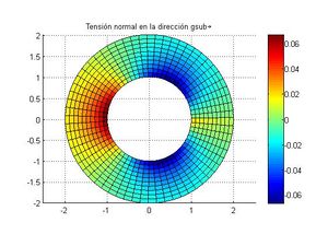 - Dibujar las tensiones tangenciales respecto al plano ortogonal a [math]\vec g_\theta/\rho[/math], es decir [math]|\sigma \cdot \vec g_\theta/\rho-(\vec g_\theta/\rho \cdot \sigma \cdot \vec g_\theta/\rho) \vec g_\theta/\rho|[/math]. ¿Donde son mayores? Compararla con los puntos de mayor deformación de la malla.