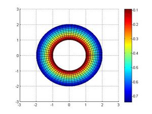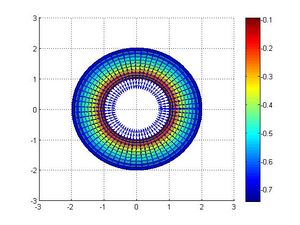 Consideramos una placa plana (en dimensión 2) que ocupa el anillo comprendido entre las circunferencias centradas en el origen de radios 2 y 1. En ella vamos a suponer que tenemos definidas dos cantidades físicas: la temperatura [math]T(\rho,\theta,t)[/math], que depende de las dos coordenadas polares [math](\rho,\theta)[/math] y el tiempo [math]t[/math], y los desplazamientos [math]\vec u(\rho,\theta,t)[/math]. De esta forma, si definimos [math]r_0(\rho,\theta)[/math] el vector de posición de los puntos de la placa en reposo, la posición de cada punto [math](\rho,\theta)[/math] de la placa en un instante de tiempo [math]t[/math] viene dada por: [math] \vec r (\rho,\theta,t)= \vec r_{0}(\rho,\theta)+\vec u(\rho,\theta,t). [/math] Vamos a suponer que sobre la placa se ha aplicado una fuerza que ha provocado una vibración de manera que los desplazamientos en un tiempo [math]t_0[/math] dado vienen dados por: [math] \vec u(\rho,\theta)=\frac{\sin(\pi \theta/2)}{30\rho}\vec g_{\rho}. [/math]