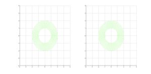 Como puede apreciarse, la variación es mínima. Ésto es debido a la ecuación del campo aplicada. En el punto de mayor deformación es a penas 1/30 para el caso del círculo interior de radio 1, y 1/60 en el caso del exterior por ser de radio 2. (Siendo por tanto evidente que el anillo se deforma más cuanto más cerca nos encontremos de su centro).