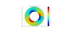 [math] \sigma_{ij}=\lambda \nabla \cdot \vec u \delta_{ij} + 2\mu \epsilon_{ij}, [/math] donde [math]\lambda[/math] y [math]\mu[/math] son los conocidos como coeficientes de Lamé que dependen de las propiedades elásticas de cada material. Tomando [math]\lambda=\mu=1[/math], dibujar las tensiones normales en la dirección [math]\vec g_{\rho}[/math], es decir [math]\vec g_{\rho} \cdot \sigma \cdot \vec g_\rho[/math] y las tensiones normales en la dirección [math]\vec g_\theta/\rho[/math], es decir [math]\vec g_\theta/\rho \cdot \sigma \cdot \vec g_\theta/\rho[/math].