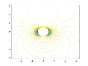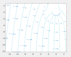 A continuación, calcularemos y representaremos la función potencial [math]φ[/math] y el campo de velocidades del fluido. Observar gráficamente (dibujando un zoom de la gráfica) que [math]\vec u = ∇φ[/math] es ortogonal a las curvas de nivel de [math]φ[/math].