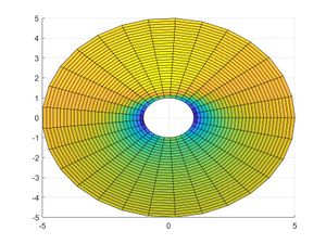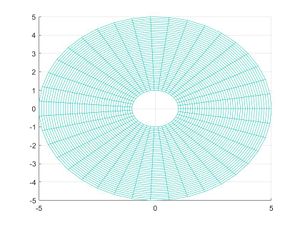 Dibujaremos un mallado que represente los puntos interiores de la región ocupada por un fluido, que será el exterior del círculo unidad. Para ello tomaremos un mallado del anillo comprendido entre los radios 1 y 5 y centro el origen. Para ilustrar que el fluido ocupa el exterior de un círculo dibujaremos los ejes en el intervalo [−5, 5] × [−5, 5].