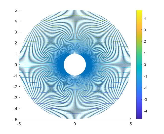 Al tener definida la superficie del anillo con los radios 1 y 5, buscamos donde están situados los puntos de frontera. Con la función potencial inicial [math]\varphi=(\rho+\frac{1}{\rho})sin(\theta)[/math] y con [math] u[/math] = [math](sin(\theta)(1-\frac{1}{\rho^2}){\vec{e}_{\rho}}+cos(\theta)(1+\frac{1}{\rho^2}){\vec{e}_{\theta}}) [/math].