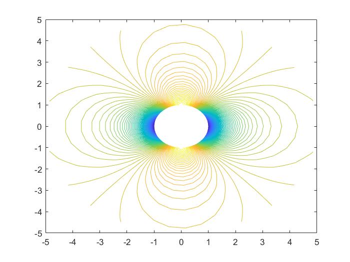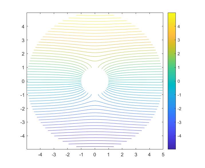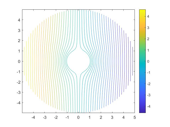 La velocidad de las partículas del fluido viene dada por el gradiente de la función potencial: [math]\varphi=(\rho+\frac{1}{\rho})sin(\theta)[/math] Las curvas de nivel de esta función potencial son las siguientes: