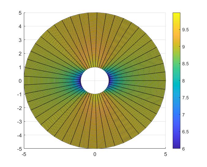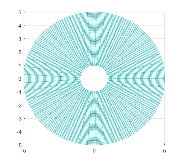 El siguiente mallado representa los puntos interiores de la región ocupada por un fluido. Se encuentra en el exterior del círculo unidad. Como ya se ha introducido, nuestro mallado del anillo está comprendido entre los radios 1 y 5 y centro el origen.