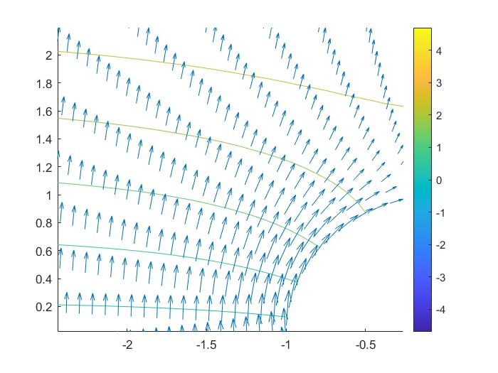 Si dibujamos nuestro campo de velocidades [math]\vec u=\nabla\varphi[/math] en matlab, la representación del mismo con flechas deberá ser ortogonal a las curvas de nivel antes dibujadas. Ya que, de forma geométrica, el gradiente es un vector normal a la curva de nivel de la función de la cual es gradiente en el punto que se esté estudiando.