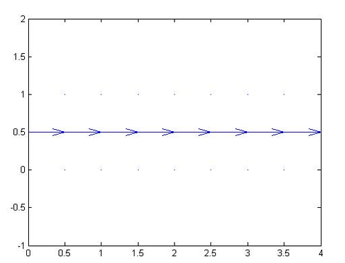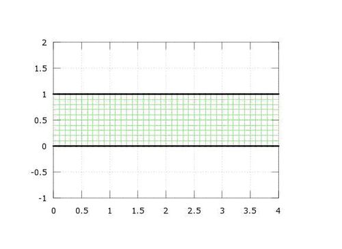 Consideramos el flujo de un fluido incompresible a través de una canal con paredes rectas. Para representarlo, usaremos las coordenadas cartesianas. Dibujamos el mallado que representa los puntos interiores del rectangulo [0, 4] × [0, 1] ocupado por un fluido. Fijamos los ejes en la región [0, 4] × [−1, 2].