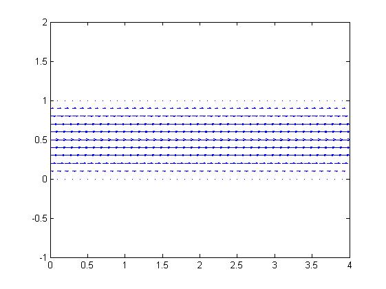 Ahora, comprobamos que la velocidad del fluido en todos los puntos (x,0) y (x,1) es nula: