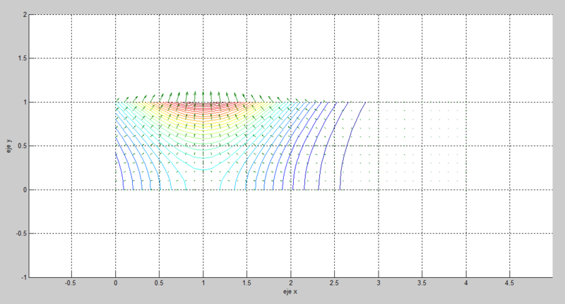 Procedemos a calcular analíticamente la expresión del gradiente del campo de temperaturas y posteriormente lo representamos con un programa informático, donde podemos comprobar, como es lógico, la ortogonalidad de éste con las líneas de nivel del campo.