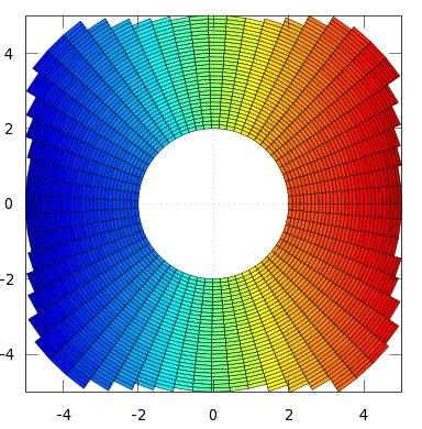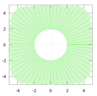 En primer lugar, vamos a representar la región ocupada por el fluido a través de un mallado circular, acotando a la región de estudio por el cuadrado [-5,5] x [-5,5].