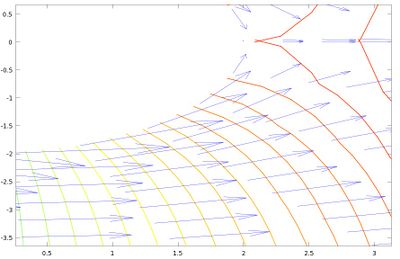 Para lograr la visualización de dicho campo se recurrirá a la representación de la función potencial [math]\varphi(\rho,\theta)=2cos \theta(\rho+\frac{4}{\rho}) [/math], cuyo gradiente son las componentes de la velocidad en cada punto [math]\vec u=\nabla \varphi[/math].
