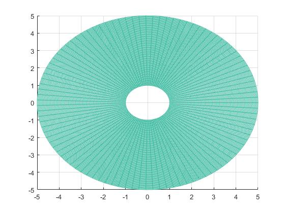 De forma previa a la realización de cálculo alguno respecto al comportamiento del fluido habrá que delimitar la región del estudio. Se nos da una corona circular de radios 1 y 5, por lo que representamos su mallado en el intervalo [-5,5] x [-5,5]: