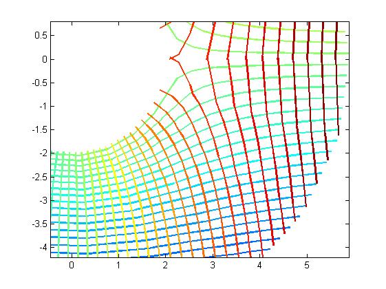 - Observamos la ortogonalidad de las líneas de corriente con el campo equipotencial ejecutando el código MATLAB posterior.Ampliando observamos con detalle la ortogonalidad.
