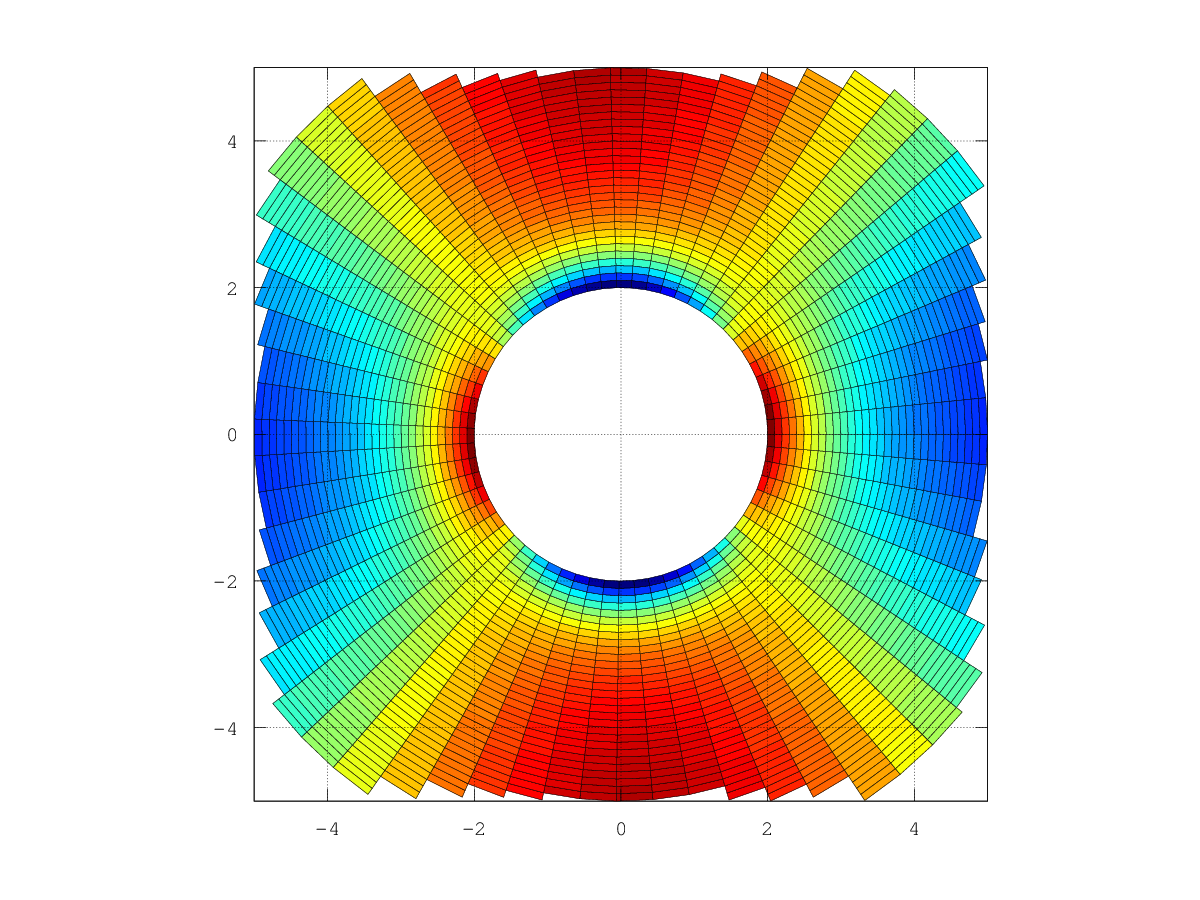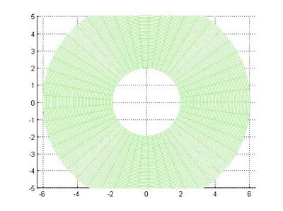 La representamos mediante un mallado que represente los puntos interiores de la corona circular en el intervalo [−5, 5] × [−5, 5]