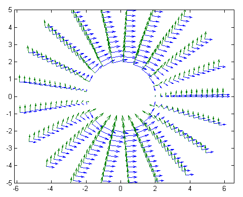 A continuación comprobaremos la circulación a lo largo de la circunferencia de radio 2. En primer lugar parametrizamos dicho obstaculo: