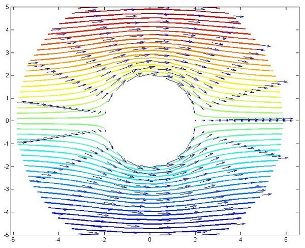 En el siguiente articulo vamos a estudiar el flujo de un fluido incompresible alrededor de un obstáculo circular. Trabajaremos con coordenadas cilindricas (polares ya que se reduce al plano) ya que debido a la forma del obstáculo los cálculos resultarán más sencillos. Las gráficas que se mostraran aqui han sido obtenidas con el programa MATLAB.