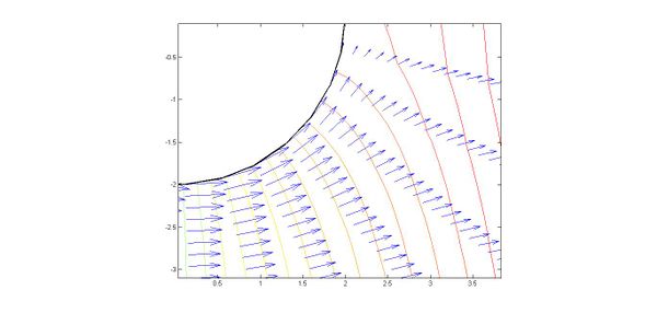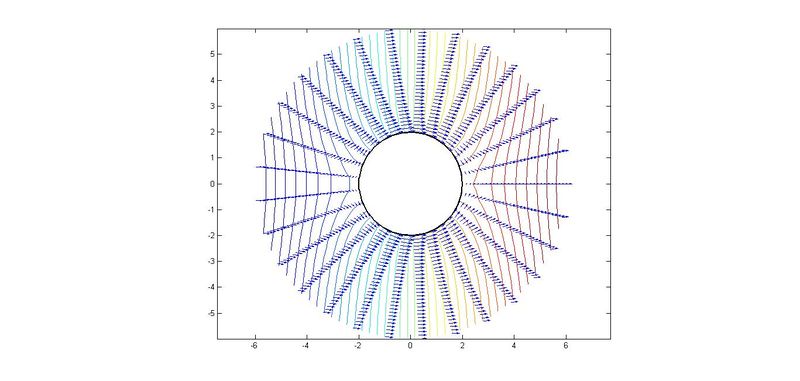 Por lo tanto como [math]|\vec{g_{\rho}}|=1[/math] entonces la velocidad del fluido en los puntos alejados del obstáculo es [math]|\vec{u}|= 2cos( \theta ) [/math]