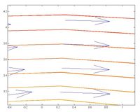 Las curvas de nivel de la función potencial representan los puntos del plano en el que esta tiene el mismo valor. Según se ve en el apartado anterior, en la representación gráfica se observa que la función crece de izquierda a derecha evitando el obstáculo. El campo de velocidades viene dado por el gradiente de esa función. El gradiente representa el valor y la dirección de máximo crecimiento de de la función escalar. Como en las curvas de nivel la función es constante, es decir, en las curvas la variación es 0, la dirección de máximo crecimiento es ortogonal a las curvas de nivel y viene dada por el gradiente, es decir por el campo de velocidades del fluido.