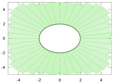 El primer paso a realizar es un mallado que represente los puntos interiores de la región ocupada por un fluido. Dicho fluido sera el exterior del círculo unidad (obstáculo). Mallamos un anillo de radio 2 a 6 centrado en el origen. Quedará patente que el fluido ocupa el exterior de un círculo dibujando los ejes en el intervalo [-5,5] x [-5x5]. El siguiente comando de Matlab muestra el mallado generado: